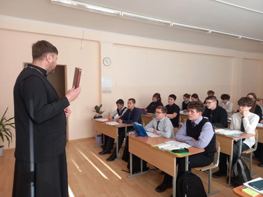 Священникъ бесѣдовалъ съ учащимися о томъ, что десять заповѣдей, данныхъ Богомъ Моисею болѣе трехъ тысячъ лѣтъ назадъ, остаются актуальными и въ современномъ мірѣ: почему важно уважать старшихъ, говорить правду, цѣнить чужое достоинство и собственное. Бесѣда получилась живой и искренней. Ребята задавали вопросы, разбирали сложныя жизненныя ситуаціи и пытались найти въ заповѣдяхъ не просто наборъ правилъ, а практическое руководство для повседневной жизни.